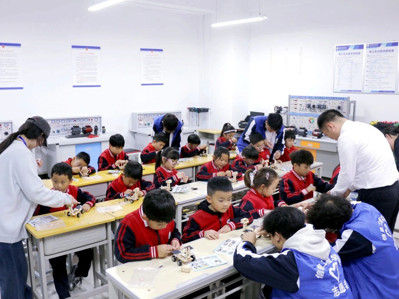 在智能制造学院3个实训室内,我校教师分别带领小学生开展太阳能小卫星、直升机模型及月球车模型制作实践。在老师与志愿者的共同指导下,小学生们亲自动手完成科技作品,学习清洁能源应用与机械原理,切身感受智能制造技术的独特风采。
