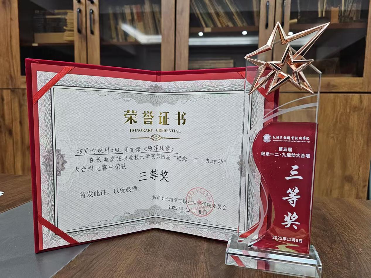 我院代表队在12月8日晚学校组织的2025年“纪念一二·九运动”大合唱比赛全校决赛中,歌声嘹亮、表现优异,荣获三等奖。
