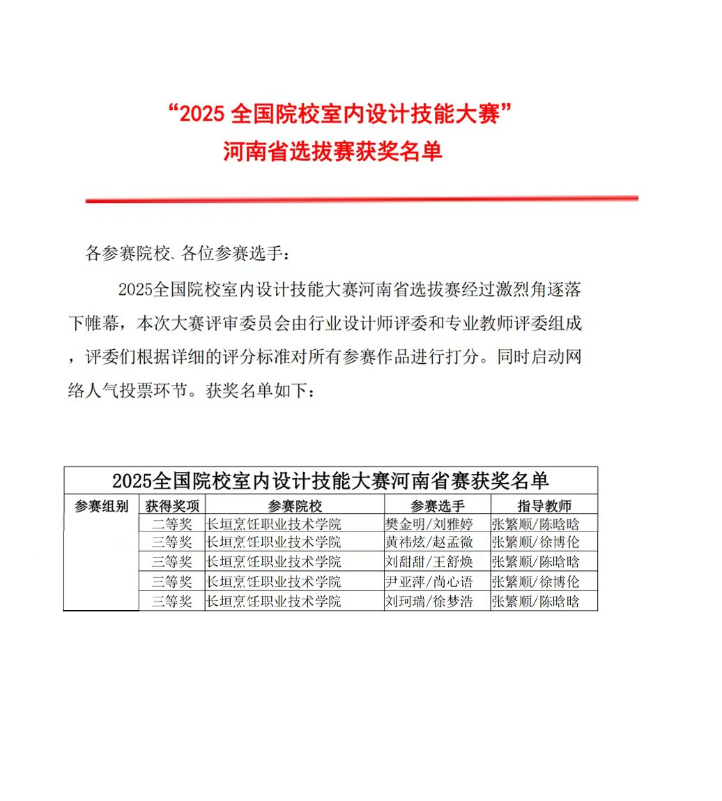 由教育部职业院校艺术设计类专业教学指导委员会指导,中国室内装饰协会、河南筑建室内设计研究院主办的“2025全国院校室内设计技能大赛河南省选拔赛”经过激烈角逐落下帷幕。该赛事专业性强,严格遵循《室内装饰设计师国家职业标准(2024年版)》相关技能要求。经过评审,我院学生参赛作品荣获二等奖一项,三等奖四项。徐博伦、陈晗晗、张繁顺老师获“优秀指导老师”称号。